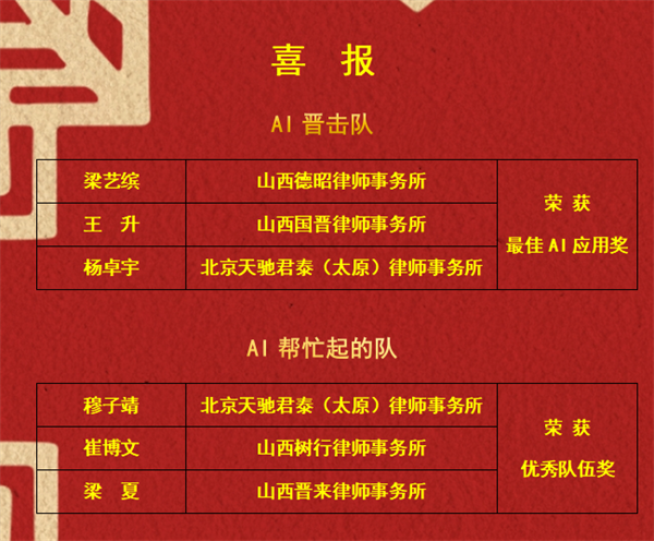 六个省会城市组建AI法律应用技能比武12支队伍,太原市律师协会两支队伍的代表杨卓宇、梁夏,带着青年律师的法律专业底气和自信昂扬的精神风貌在舞台上做了成果展示。各参赛队对科技创新产物的应用与展现形式的灵活创新令人叹为观止,使得这场AI比武不仅仅是一场美好的视觉听觉盛宴,更是一场呈现专业素养、团队协作、管理模式等综合性的技能盛宴。本次比武大赛,太原市律师协会的两支队伍分别斩获“最佳AI应用奖”和“优秀队伍奖”。