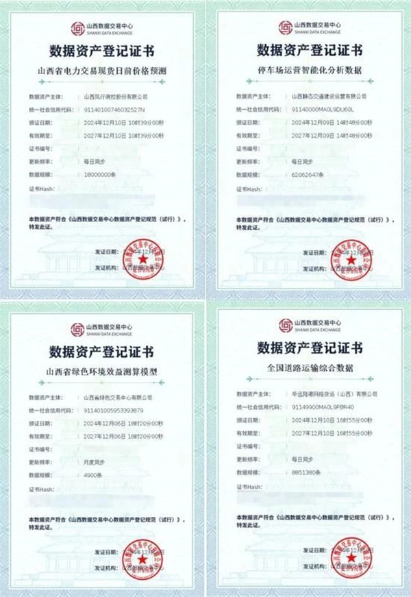 山西日报记者姚毅报道 12月18日,记者从山西数据交易中心获悉,由该中心运营的数据交易全流程服务平台正式上线后,已成功为山西风行测控股份有限公司“山西省电力交易现货日前价格预测”、山西静态交通建设运营有限公司“停车场运营智能化分析数据”、华远陆港网络货运(山西)有限公司“全国道路运输综合数据”以及山西省绿色交易中心有限公司“山西省绿色环境效益测算模型”4个数据产品完成登记,并发放首批数据资产登记证书。