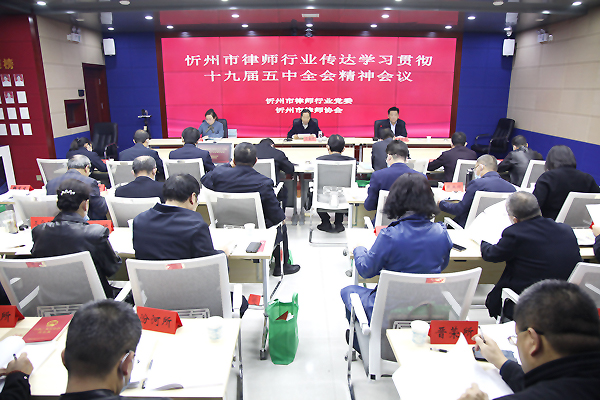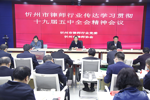 11月7日,忻州市律师行业党委、律师协会召开专题会议,学习贯彻十九届五中全会精神。忻州市律师行业党委委员,市律师协会会长、副会长,各律师事务所党支部书记及各律所主任四十多人参加会议。会议由忻州市律师行业党委副书记、律师协会会长史利岗主持。忻州市司法局党组成员、副局长,市律师行业党委书记王春华参加并领学十九届五中全会精神。