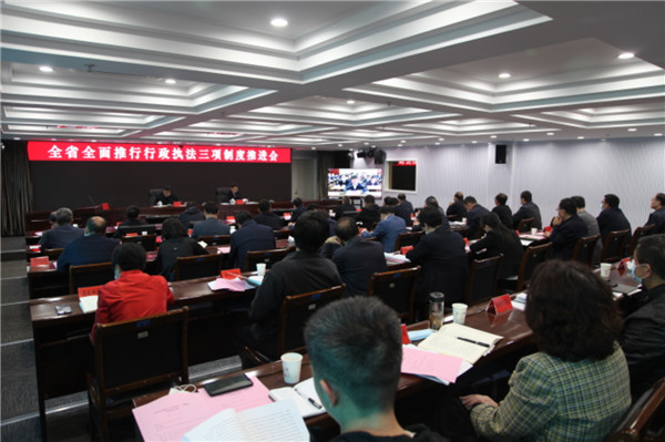 全面推行行政执法公示制度、执法全过程记录制度、重大执法决定法制审核制度,是党的十八届四中全会部署的重要改革任务,对于推进严格规范公正文明执法,保障和监督行政执法机关有效履行职责,维护人民群众合法权益具有重要意义。会议指出,省委、省政府坚决落实党中央、国务院部署要求,将全面推行行政执法三项制度列入2020年《政府工作报告》重点工作和省委全面依法治省委员会工作要点。各级行政执法机关初步建立起一套严格规范公正文明执法的制度机制,给执法人员确立了“新思维”,戴上了“紧箍咒”,划下了“标准线”,我省全面推行行政执法三项制度工作取得了阶段性成效。