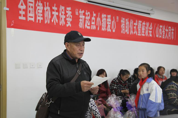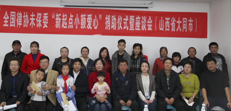 为迎接党的十九大胜利召开,在全社会进一步掀起关爱祖国未来,关注未成年人的成长氛围,10月17日下午,由中华全国律协未成年人保护委员会、山西省律师协会、共青团大同市委、大同市律师协会共同举办的“新起点—小额爱心”捐助仪式暨座谈会在共青团大同市委会议室举行。全国律协未保委副主任王毅伟,省律协副会长、未保委主任彭建荣,省律协顾问郭福元,省律协培训部副主任刘艳和大同市司法局副局长刘建军,大同律协会长臧文,大同市中级法院、市司法局、市妇联、市教育局、市法律援助中心等单位参加了活动。10名受助未成年人及家长等共计40余人出席了资助仪式。
