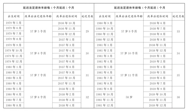 一、同步启动延迟男、女职工的法定退休年龄,用十五年时间,逐步将男职工的法定退休年龄从原六十周岁延迟至六十三周岁,将女职工的法定退休年龄从原五十周岁、五十五周岁分别延迟至五十五周岁、五十八周岁。